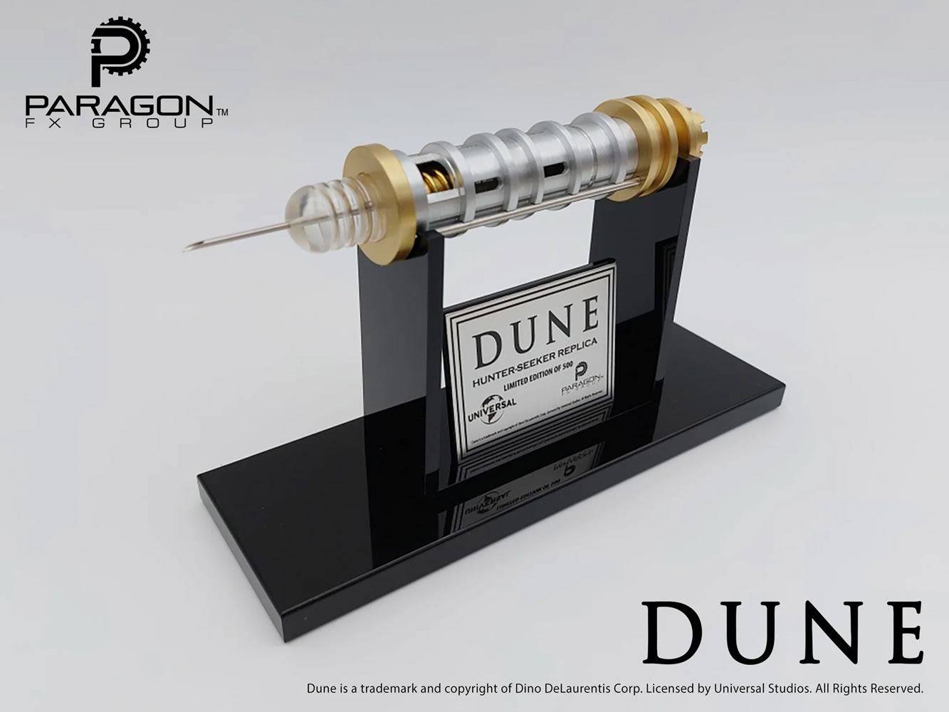 Paragon FX Group has replicated the Hunter Seeker with exceptional attention to detail, recreating its menacing appearance in machined brass, aluminum and acrylic. Each prop replica ships complete with acrylic display stand and metal plaque. This run is limited to 500 pieces and will not be repeated.
