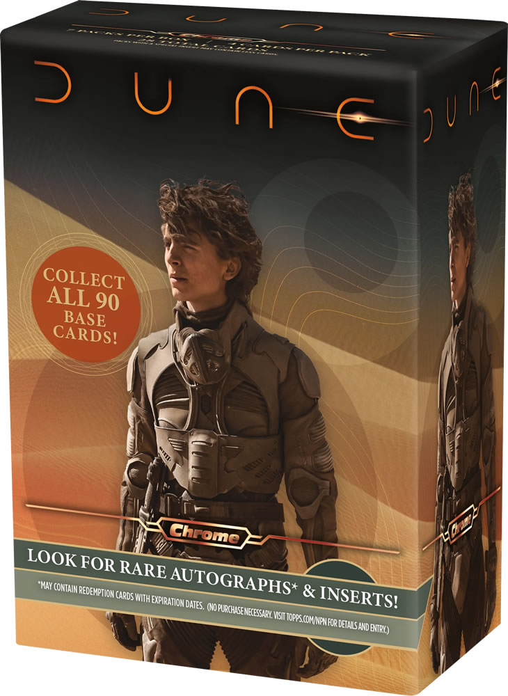 2024 Dune Chrome® marks the first-ever Chrome® trading card product from the 6-time Academy Award winning film, bringing the epic world of Arrakis to collectors in stunning Chrome® style. Packed with elite talent autographs, innovative card technology, and unforgettable chase hits, this release is destined to be a cornerstone of any collection.